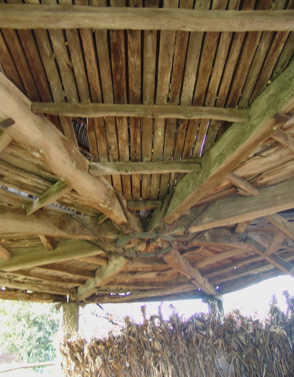 O revestimento da cobertura em Colmo foi substituído por chapa ondulada de alumínio no momento em que deixou de haver quem realizasse a sua manutenção.